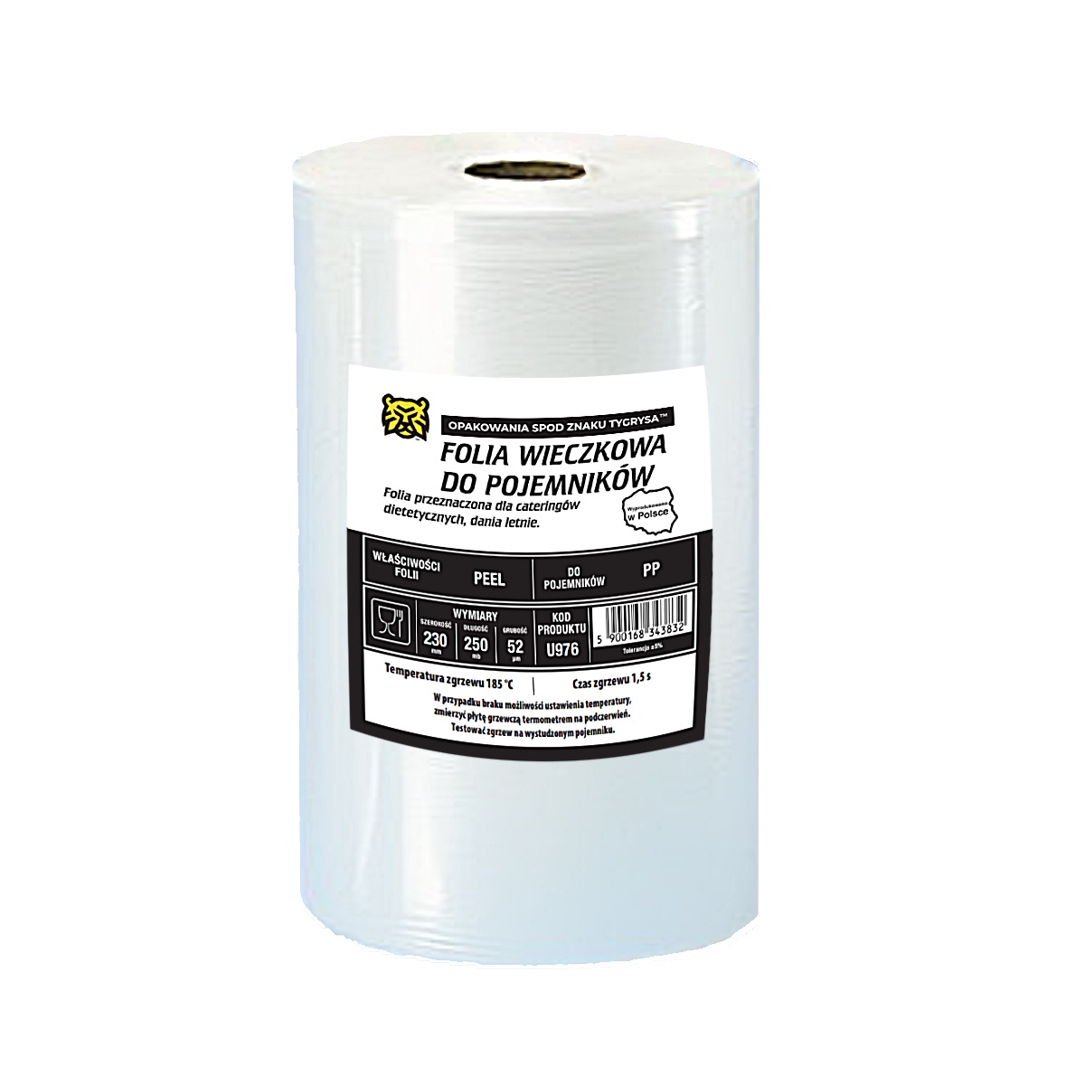 Folia wieczkowa, barierowa, transparentna - wykonana z folii PET/PE o szerokości 230mm i długości 250 metrów bieżących. Służy do zgrzewania i zamykania pojemników PP oraz powlekanych PE. Folia idealnie sprawdza się do cateringów dietetycznych pakujących dania zimne lub letnie, zawsze odrywa się w jednym kawałku, w folii jest zastosowany bardzo wysokiej jakości peel. Zgrzewając folię na zgrzewarkach ręcznym nie musimy się martwić iż folia zostanie przegrzana. Jest to jedyna folia na rynku która bez względu na temperaturę oderwie się zawsze idealnie, w jednym kawałku. Wykonujemy najwyższej jakości nadruki aż do 10 kolorów, minimalne zamówienia folii z nadrukiem to pełna paleta 600KG Jeśli nie zadowala cię nasza folia, na pewno potrzebujesz innego rodzaju, który pewnie mamy. Daj nam znać, nasz przedstawiciel przyjedzie i dobierze odpowiedni produkt do twoich potrzeb. Twoje zadowolenie to tylko kwestia doboru rodzaju folii który już mamy albo będziemy mieć właśnie dla ciebie. Szerokość folii 230 mm Długość 250 mb Grubość 52 mikrony Kod : U976 Gwarancja idealnego zgrzewu" Temperatura zgrzewu 170-185°C Temperatura zgrzewu pojemniki powlekane PE 110°C do 120°C Czas zgrzewu 1 do 1,5 s W przypadku braku możliwości ustawienia temperatury, zmierzyć płytę grzewczą termometrem na podczerwień. Testować zgrzew na wystudzonym pojemniku.