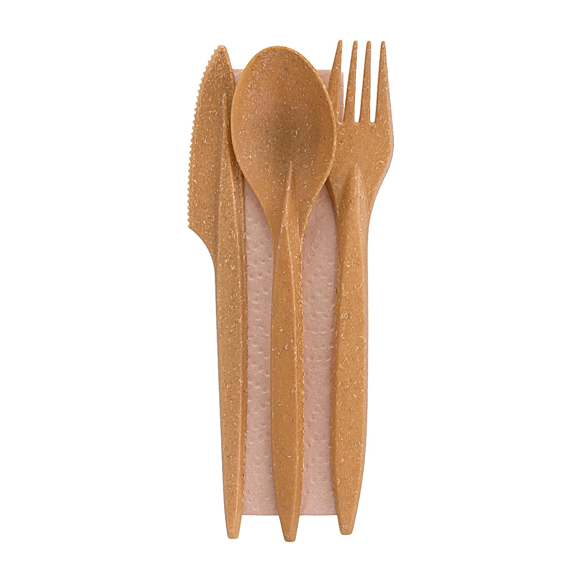 Komplet sztućców wielorazowych, mieszanka drewna oraz polistyrenu. Sztućce posiadają certyfikat wielorazowego użycia i nadają się do mycia w zmywarce.